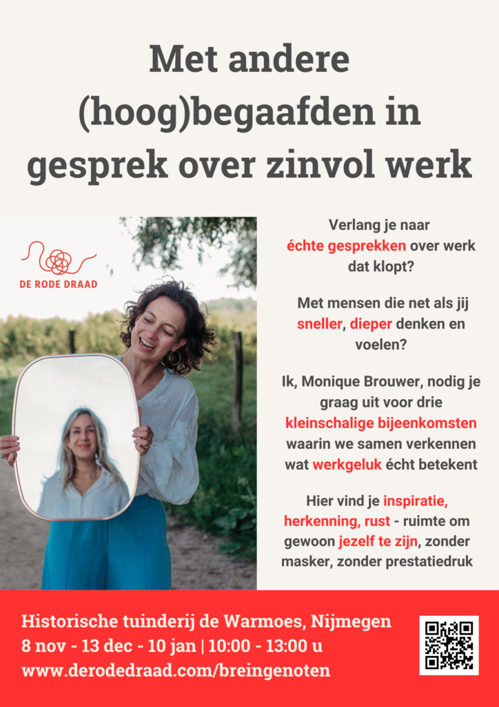 In drie bijeenkomsten ontmoet je andere (hoog)begaafde en neurodivergente volwassenen die, net als jij, dieper denken, intenser voelen en verlangen naar werk dat klopt. We delen verhalen, vinden (h)erkenning, rust en inspiratie. Niet om alles meteen te ‘fixen’, maar om het vuur te doen oplaaien wat jou richting meer werkgeluk brengt.